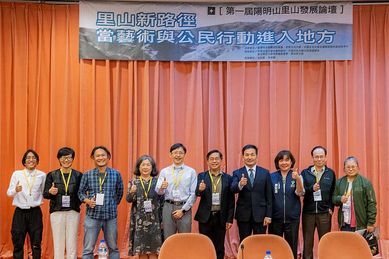 與會貴賓於「第1屆陽明山里山發展論壇」合影,論壇於14、15日在曉峰國際會議廳舉行,匯聚產官學與在地行動者,共探藝術行動、里山文化與永續發展的跨域連結。「公私協力圓桌論壇」由文化大學行政管理學系主任黃榮源教授主持,邀集政治大學江明修名譽教授、文化大學黃瀕儀副教授、士林區副區長郭冠蓮、北投湖山里李秋霞里長及菅芒工作室負責人凌斈田,共同討論里山倡議如何透過政府、社區、學界與企業協作,形成長期合作網絡,並檢視國家公園管理、社區營造及地方創生等制度在支持地方行動上的挑戰與改良方向。