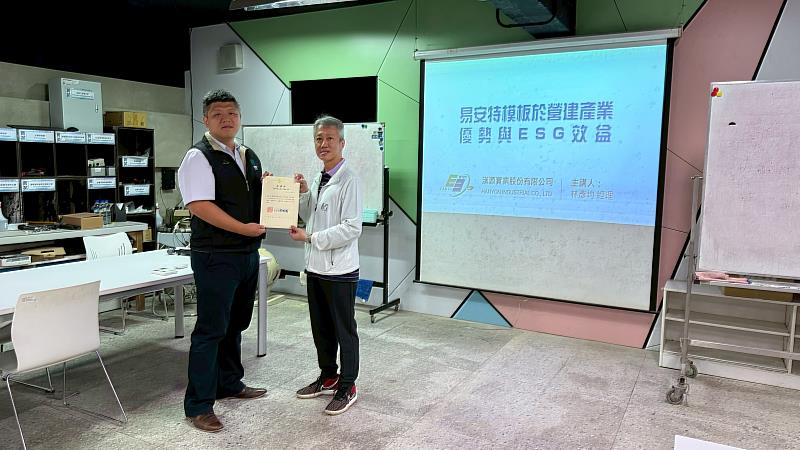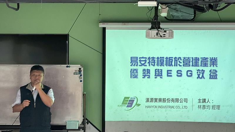 首場演講由漢源實業林彥均經理主講「易安特模板於營建產業優勢與ESG效益」。林經理在演講中指出,傳統木模施工常面臨耗材量大、廢棄物處理困難等問題,而「易安特模板」(系統模板)具備高強度、重量輕且可重複使用次數高等特性,不僅能大幅提升施工效率與精準度,更能有效減少建築廢棄物。林經理強調,導入系統模板是營建業實踐環境保護(E)、社會責任(S)與公司治理(G)的重要一環,透過減少森林砍伐與降低碳排放,企業能具體落實綠色施工,提升整體競爭力。