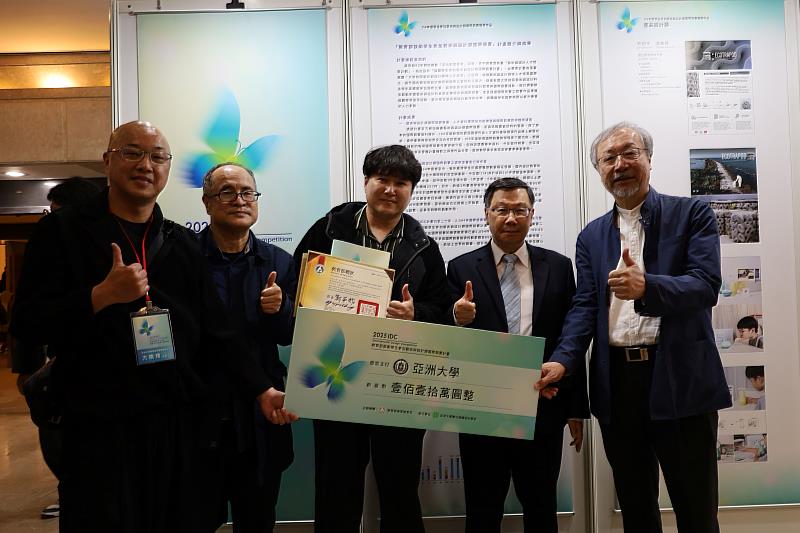 亞大校長蔡進發(右2)、亞大講座教授林磐聳(右1)和上台發表得獎感言的陳郭益言同學(中)等合影。