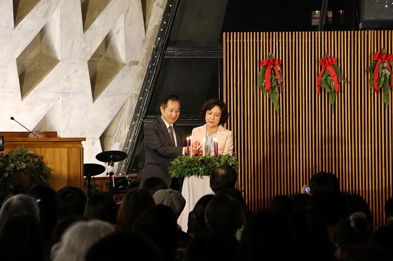 路思義教堂外牆同步展演大型光影投影、校園沿途規劃聖誕市集與文創攤位、聖誕快閃表演,吸引不少民眾駐足,宛如一場溫馨的節慶嘉年華。教堂內的子夜禮拜由主任牧師陳尚仁主持,以「為愛降生,有一嬰孩為我們而生」為題,透過莊嚴而寧靜的儀式,傳遞信仰的核心價值。與婦女會會長羅蕙蓮一起點亮蠟燭的張國恩校長表示,他和夫人希望每一位走進東海的人,都能在耶穌基督誕生的日子裡,感受到安定與祝福,帶著平安與盼望迎向新的一年。