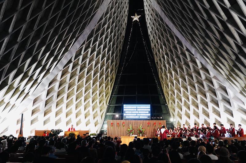 東海大學昨(24)日以「為愛降生」為主題,在路思義教堂舉行聖誕平安禮拜。校園同步點亮夜光玫瑰園、永續聖誕樹,形塑溫馨且極具辨識度的校園聖誕城。