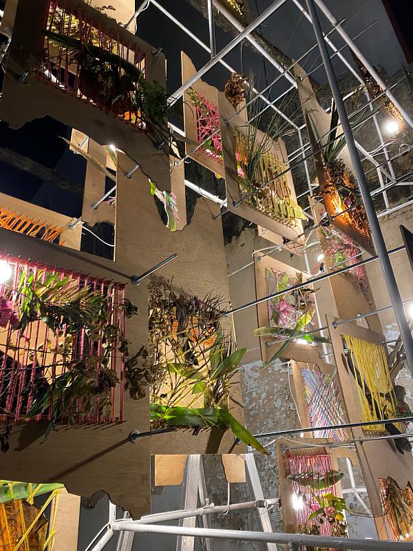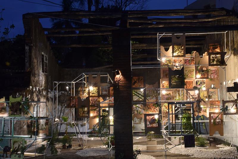 空設系該次得獎創作品《地空膠囊》(Capsule of Space and Time)設置於龍崎老街舊相館遺構,以沿山稜線排列的街屋脈絡作為創作底圖,作品取材自龍崎居民自1950年代以來的生活記憶,將地形剖面的木板化為耆老們描繪故事的畫板,並以周邊山野植物所得顏料進行創作,長者的筆跡如同重現的影像,片片木板在空間中排列,如同相館櫥窗中重新被點亮的照片,作品完成後,儼然成為一座由居民與學生共同完成的新門面,在光節期間重新點燃龍崎曾經的夜燈,為老街再生提供跨世代共作的文化策略。