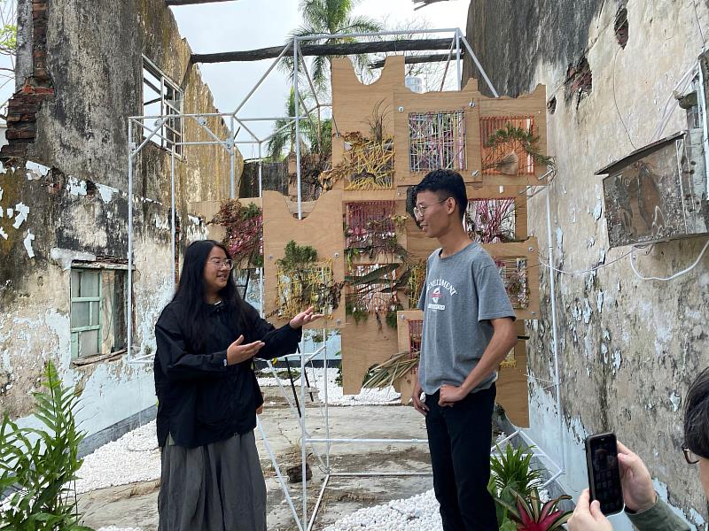 參與作品的研究生林佳妤(左)和黃傳懿(右)於《地空膠囊》裝置前討論創作細節。