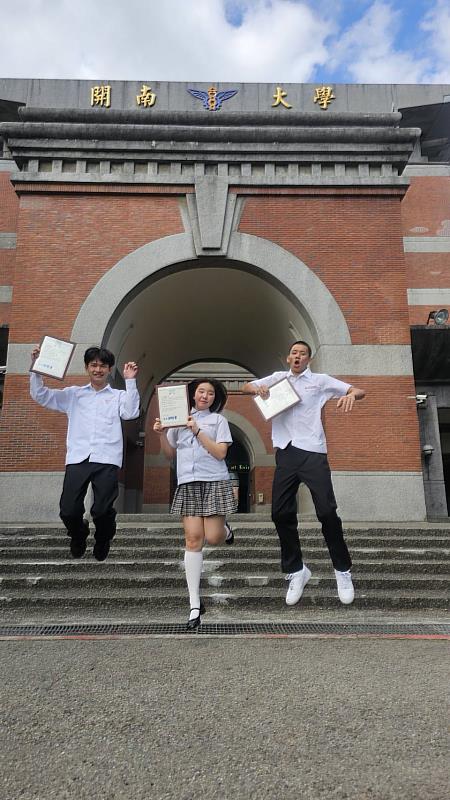 開南中學藍浩倫、劉海華、曹若謙獲高中組第1名,於校門前跳躍合影。