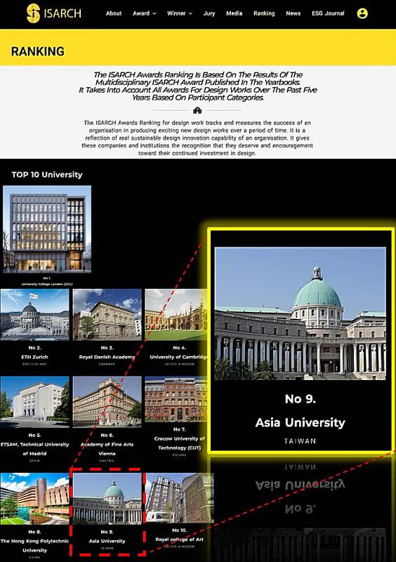 值得一提的是,亞大今年在全球排名中較往年更進一步,亞大標誌性的歐風圓頂建築地標照片,更被同步刊登於「ISARCH獎」官方網站,與國際頂尖大學並列,不僅是對亞大教學成果的肯定,也成功為台灣爭光。