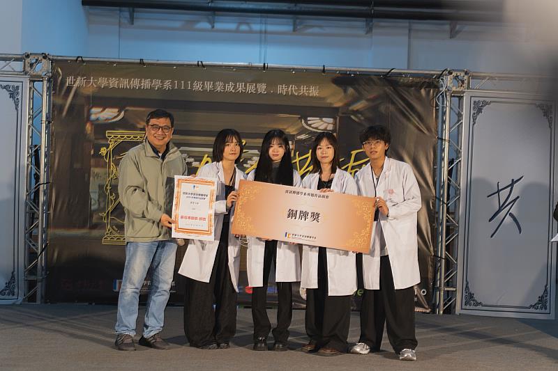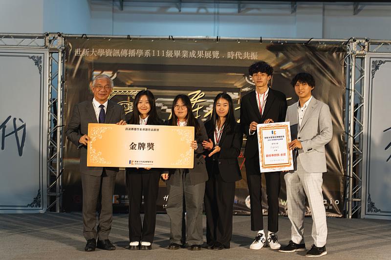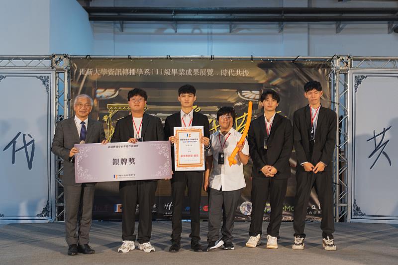 世新大學校長陳清河(左1)頒發資傳系畢業專題銀牌獎予專題小組「青山」。(世新大學提供)