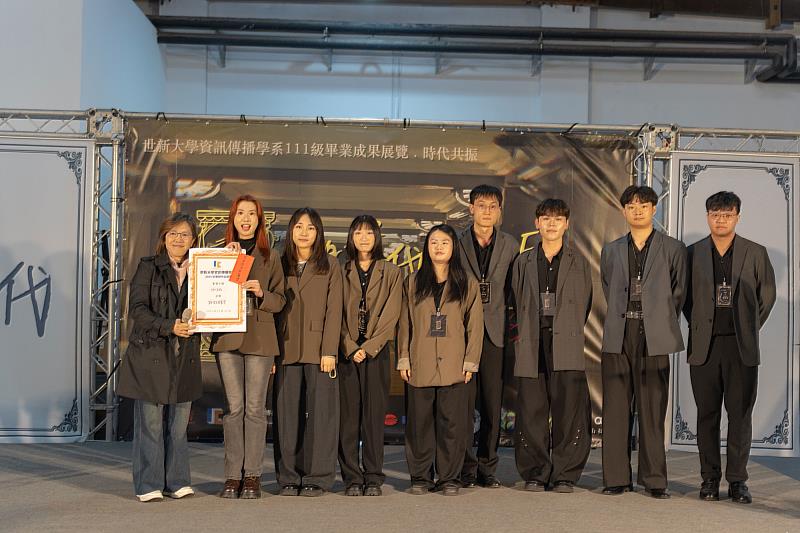 飛資得資訊總經理江思嫺(左1)頒發傑出策展推薦獎予策展小組「第一象限」。(世新大學提供)世新大學資傳系畢展《時代共振》 AI與創意點燃人文新思維 | 中央社訊息平台