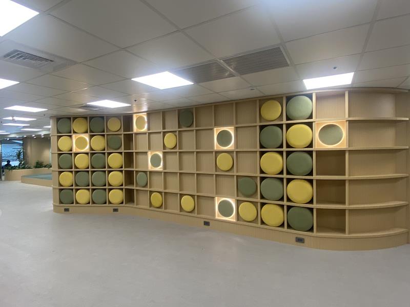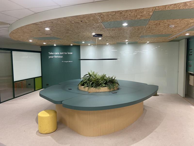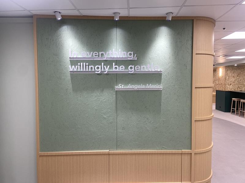 文藻「創新自主學習空間」以多元使用、合作共學、自主成長為核心理念,整體設計融入聖吳甦樂修會會祖聖安琪的智慧語錄,作為境教陪伴與精神引導,營造兼具人文關懷與學習能量的校園環境。場域內依功能規劃多元活動空間區、自主學習閱讀區、鏡面牆舞蹈教室、學生陪伴交流區及合作學習討論區,可靈活支援課業研讀、團隊討論、表演練習與師生互動等多樣使用情境。