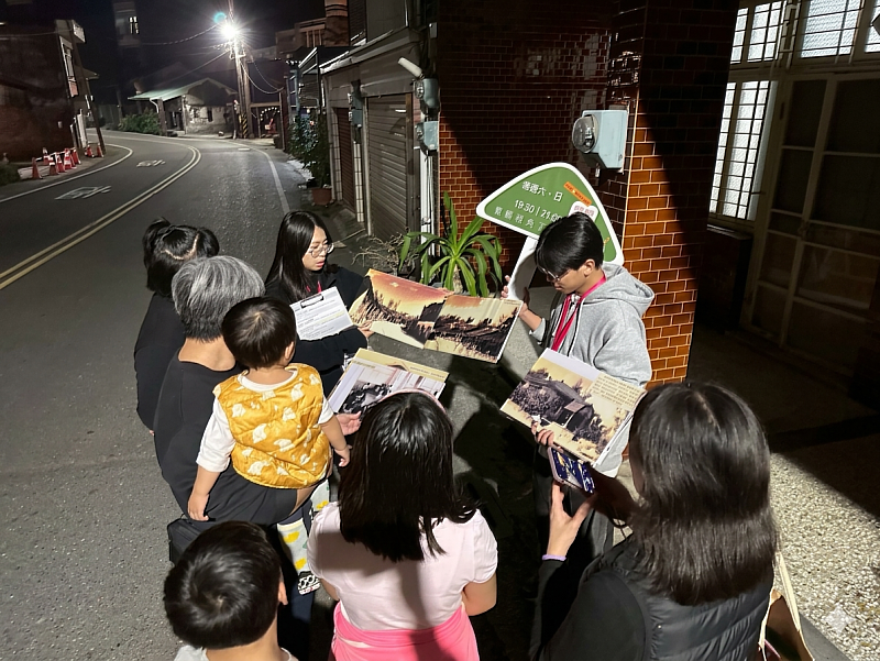 學生帶領民眾在夜間走讀老街,對照歷史照片與現場街景,分享昔日「不夜街」的生活記憶